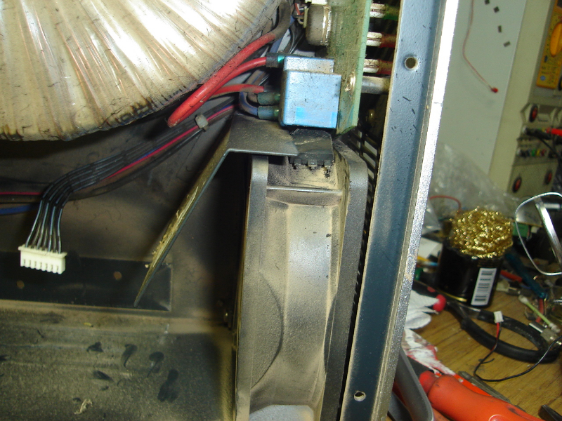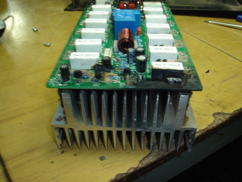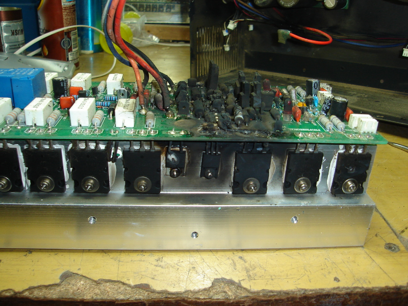 Me contó el dueño, que mientras estaba funcionando, le conectó el otro sub woofer y los alambres se tocaron , el se asustó al ver que explotaba todo y no atinó a apagarla hasta que dejó de tirar humo, pero el "moco" se lo mandó el mismo, lo que me llama la atención es que no tenga fusibles en la salida del toroidal ni en la fuente, así que siguió mandando la tensión hasta que se abrió la alimentación, fijate que un transistor lo cortó y quedó en el cooler!!!
