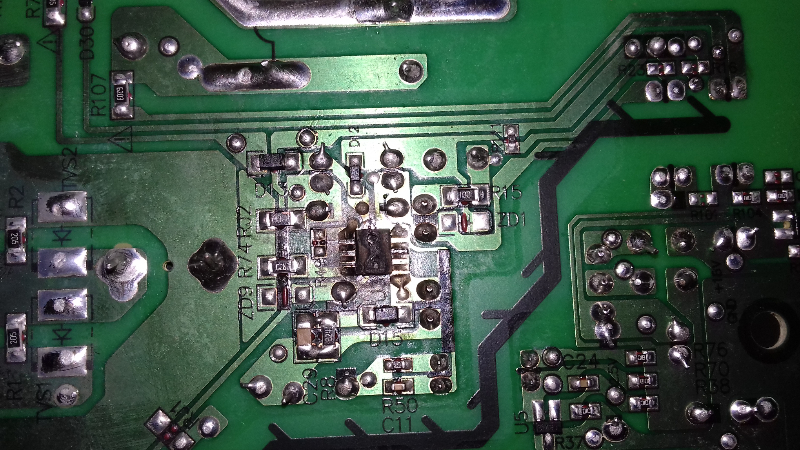 En la tarjeta fuente tiene el IC de superficie quemado y no puedo ver el numero para poder reemplazarlo. Este es uno de 8 pines ubicado por debajo de la tarjeta fuente en el primario del transformador .