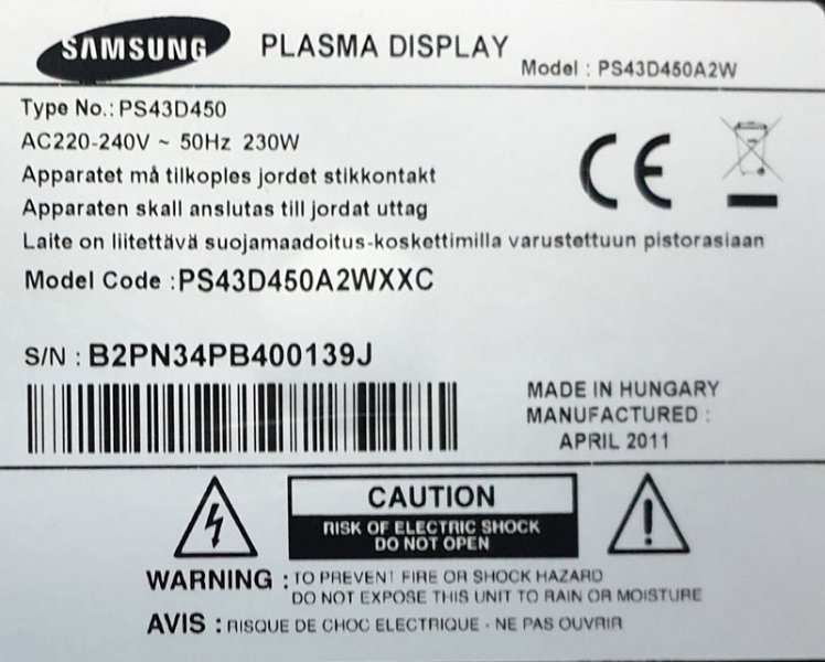TV Samsung Plasma, modelo: PS43D450A2W, Chasis 842AX-YB11, el problema es que no enciende.