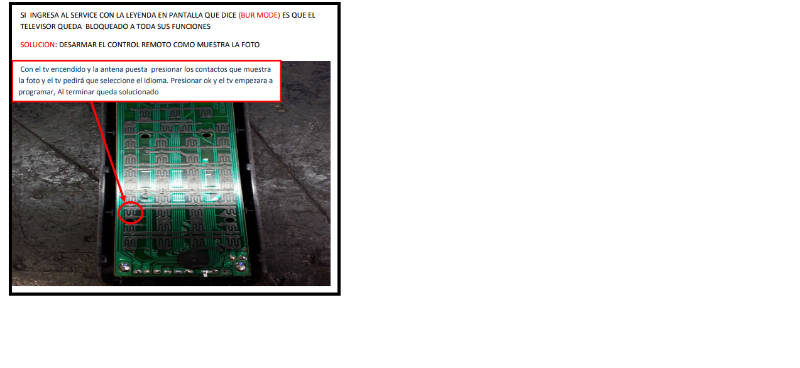 buenas tardes tengo este tv que tiene la palabras burn mode no responde a ningún comando ni en el panel del tv quedo bloqueado solamente el boton source del control desarme el control hice una limpieza y no tiene teclas ocultas,verifique los voltaje de la main aparentemente todo normal si alguno tiene conocimiento como entrar al modo de servicio,gracias.-