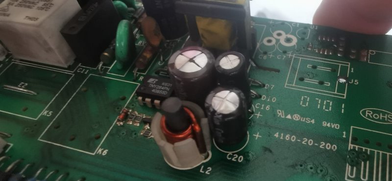 Misma falla resuelta cambiando capacitores de 680 y 470, los que se ven inflados en la foto.